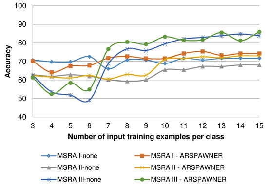 To determine the capability of the introduced ARSPAWNER to augment small datasets, composed of a small number of training examples per class, it was tested using the MSRA I-III datasets varying the number of input time series. This experiment also indicates problems with small benchmark datasets in which class boundaries cannot be easily established due to an insufficient amount of available data and a relatively large number of classes (i.e., there are eight classes in the MSRA datasets). In the experiment, 3 to 15 input examples per class were randomly selected and used by ARSPAWNER to generate synthetic data. Then, the average accuracy of the nearest neighbor classifier with the DTW distance based on ten draws is reported in Figure 9. Overall, as reported, ARSPAWNER can improve the results of the classifier based only on a few available training samples. Depending on the dataset and the way testing examples are scattered in the feature space, the positive effect of the augmentation is visible even for five input examples.