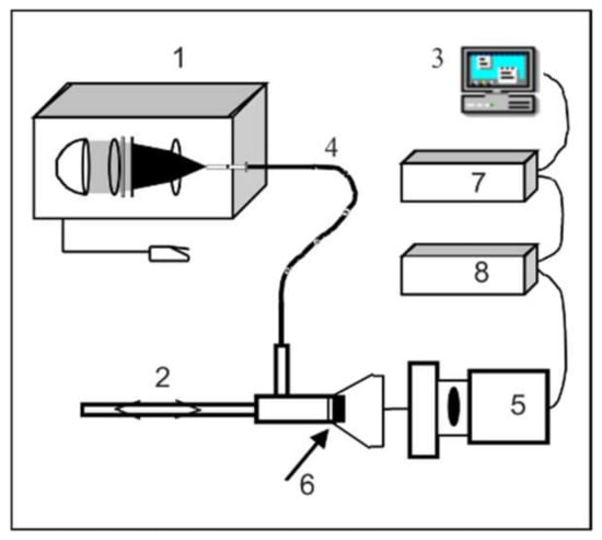 Optical diagram of the fluorescence imaging system: 1—light source with a violet filter (λ = 405 ± 25 nm), 2—endoscope, 3—monitor, 4—liquid optical fiber, 5—CCD camera, 6—optical filter, 7—computer, 8—video.