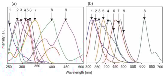 Spectral characteristics of potential endogenous fluorophores: 1—collagen, 2—tryptophan, 3—elastin, 4—pyridoxamine phosphate, 5—pyridoxine, 6—pyridoxal phosphate, 7—NADH, 8—protoporphyrin IX, 9—FAD. (a)-absorpton spectra, (b) emission spectra.