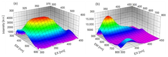 Typical single fluorescence characteristics consist of an excitation (equivalent to the absorption spectrum) and emission spectra. By changing the wavelength of the excitation radiation in the entire absorption range, an emission–excitation (EM–EX) matrix is obtained. It is the real spectral imprint of the tested sample. The method is of particular interest for the analysis of substances containing various fluorophores. In addition, it enables the selection of appropriate wavelengths for testing. Figure 4 shows the enamel and dentin EM–EX matrices.
