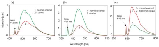 The LIF spectra with selected excitation wavelengths are shown in Figure 5. The level of fluorescence of the enamel with caries is lower compared to the unchanged enamel. In the case of dental caries, an increased level of fluorescence is observed, which is associated with porphyrin derivatives generated by bacteria.