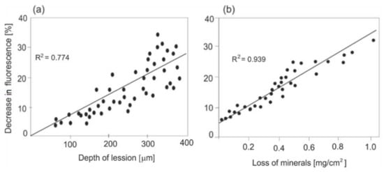 Figure 6 shows the relationship between the decrease in fluorescence intensity and other parameters characterizing the degree of caries: the depth of changes and the degree of mineral loss. Measurements of these parameters were carried out using the microradiography method, and the average decrease in the fluorescence of the demineralized area was determined using a LIF spectrometer with radiation excitation and a wavelength of 407 nm.