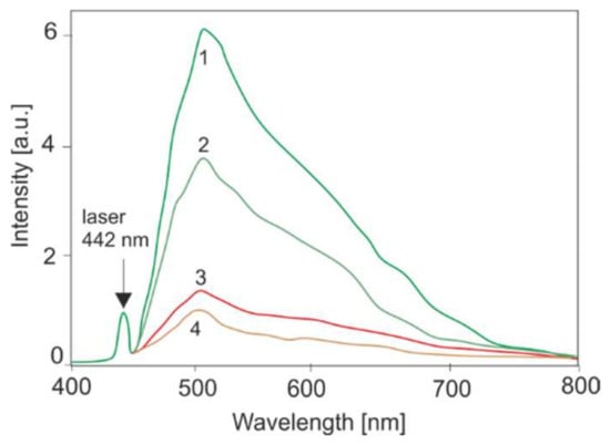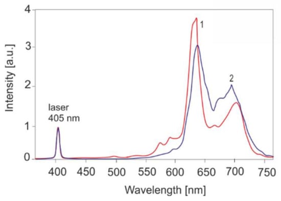 Quantitative laser-induced fluorescence (QLF) is a new diagnostic technique for enamel caries evaluation and the monitoring of mineral changes in initial caries [3]. The level of the fluorescence intensity of enamel changed in vivo is lower compared to healthy enamel. The decrease in fluorescence effect is mainly due to the scattering of excitation and emission light on damaged surfaces of hydroxyapatite. The coefficient of light scattering on decalcified enamel is 5–10 times greater than that on normal enamel. Research on the use of LIF has been ongoing for 40 years and was started by Bjelkhagen and Sundström [4]. They induced the fluorescence of a tooth material with nitrogen (N: 337 nm) and argon (Ar: 488, 514 nm) lasers. The intensity of the fluorescence emission in the blue–green range decreased with the increased degree of carious enamel decalcification for the excitation wavelengths given above. The field of this research is still continuing and is the subject of many current scientific articles [5,6,7,8,9,10,11].