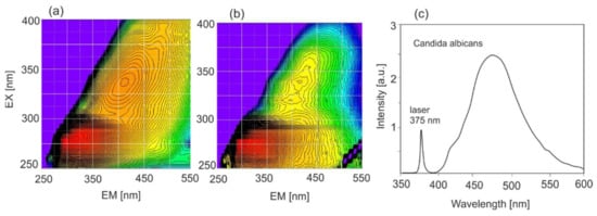 Spectral characteristics of selected fungi: (a) EM–EX map of Penicyllium chrysogenium, (b) EM–EX map of Aspergillus flavus, (c) LIF spectrum of Candida albicans.