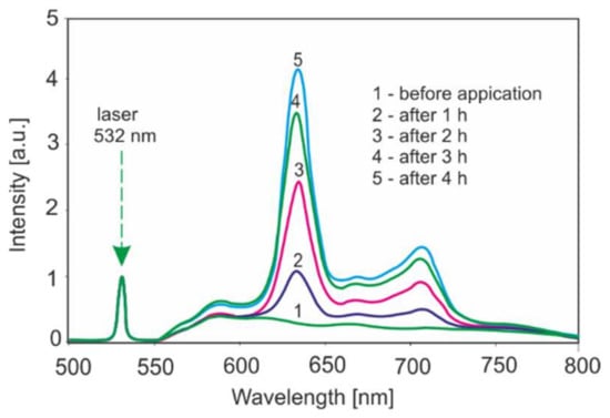 An example of the kinetics of PPIX accumulation after ALA application in the case of a change in actinic keratosis is shown in Figure 10. These studies are necessary in respect of introducing new methods to the market to form ALA [30].