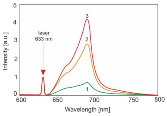 LESA is a PC-based spectroscopy system consisting of a laser source for fluorescence excitation, a miniature monochromator, multichannel CCD detector, an optic fiber sensor and a computer for data acquisition and processing (Figure 1). The entire fluorescence spectra range is recorded simultaneously. The intensity of fluorescence depends on the irradiance, the distance between the sensor and the light, and the position of the sensor. Thus, it is important to normalize the signals. The monochromator receives fluorescence emission and is scattered on the tissue by laser radiation, which is attenuated 103 times by an appropriate optical filter. The monochromator receives fluorescence radiation and laser radiation scattered on the tissue, which is attenuated 103 times with an appropriate optical filter. The obtained spectra are normalized to the laser signal. It is a convenient reference signal for the fluorescence measurements. The laser emission to fluorescence area ratio depends only on the concentration of the fluorophore (e.g., Figure 8 and Figure 9). Our goal was to develop a technique for quantifying fluorophores in all possible medical cases—for caries testing, PDT sensitizers and cancer by autofluorescence (endogenous sensitizers). The only such commercially available system is the LESA spectrometer, equipped only with an He-Ne laser (633 nm). Therefore, the area of an application was limited only to selected sensitizers. We have modified the system by using many lasers in the UV–VIS range, which allows us to excite the fluorescence of virtually all chemical compounds, including those of biological origin.