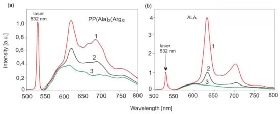 Comparison of accumulated porphyrin concentrations in (a) cervical cancer PP (Ala)2(Arg)2 and (b) vaginal (ALA): 1—tumor in the center of lesions, 2—tumor on the border, 3—normal tissue.