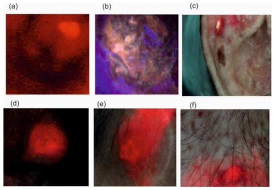 Fluorescent images of (a) vaginal, (b) cervical, (c) basal cell carcinoma of head, (d) squamous cell carcinoma of nose, (e) actinic keratosis of skin, (f) after ALA applications.
