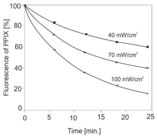 Apart from the research on the kinetics of photosensitizers’ accumulation in tissues, the LIF method is helpful in determining the light power density in the PDT method. During irradiation, the photochemical decomposition of porphyrins takes place, and this process depends on the intensity of the light. The photobleaching effect of the sensitizer as a function of irradiation is shown in Figure 14. When using a power density of 100 mW/cm2, the degradation of the sensitizer occurs much faster than at 40 mW/cm2, the therapeutic effect is insufficient and the treatment procedure must be repeated.