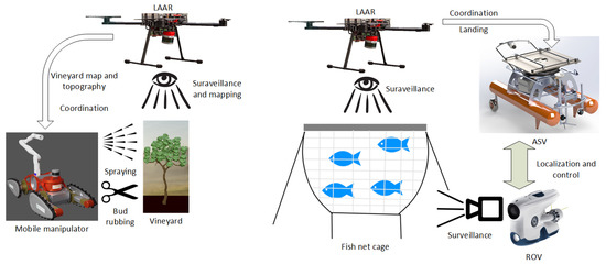 The main contributions of this work are (1) the heterogeneity of the proposed robotic system in terms of including aerial, ground and marine vehicles—to the best of the authors’ knowledge, no such system exists in the literature, as explained in more detail in the Section 2 and Section 3. Therefore, the concept of such a system, together with the design of the vehicles and the integration of the subsystems, is the main novelty. The second is (2) the heterogeneity of applications for the proposed system, i.e., the same system can be used in both viticulture and mariculture, with the LAAR being the link; the third is (3) the use of an autonomous cooperative multi-robot system in unstructured environments such as steep karst vineyards and fish farms to solve the problem of tedious and often dangerous manual labor.