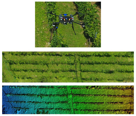 Monitoring the vineyard from the air, top—LAAR monitoring the vineyard, middle—stitched RGB image, bottom—generated 3D model.