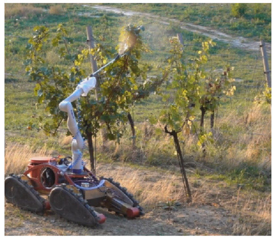 Conventional vine protection requires a lot of protective chemicals because the vine is highly exposed to many pests (e.g., red spider, grape berry moth) and diseases (e.g., downy mildew, powdery mildew, gray mold and black rot disease). Conventional protection requires many sprays with various agents such as insecticides, fungicides and acaricides. The result of spraying is the introduction of a significant amount of chemicals into the immediate environment of the vineyard. Nowadays, the chemicals are applied with blower-like machines that create a cloud of chemical droplets. However, many of the droplets do not land on the leaves. A significant portion of the chemicals end up in the soil or in the air [21,22]. These chemicals can have serious consequences for the health of farmers [23]. The use of robots for vineyard spraying opens up a number of opportunities to reduce the amount of chemicals introduced into the environment by using artificial intelligence to optimize the chemicals used to the minimum necessary.