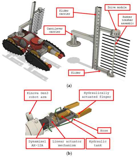 The task of suckering is significantly complicated by the presence of wires near the vine. Accordingly, this task can be approached in a number of ways, from the simplest, which uses dedicated rubber threshing mechanisms, to the most complex, which uses depth cameras and compliant end effectors and detects the shape of the trunk, determines the position of the wire and controls the movements of the suckering tool. The most complex possible approach would be to get near the trunk, create an accurate 3D model and then use that for the precise autonomous removal of undesirable shoots. More complex approaches would require significant computational effort that would slow the execution of the task to a level that could become unacceptable for the use of the robotic system. Regardless of which approach to solving this task would be faster and more efficient, the development of suckering solutions in the HEKTOR projRefect goes both ways. In Figure 4, the conceptual design of the tool with a height-adjustable rubber threshing mechanism is shown on the left, and the compliant, hydraulically actuated gripper is shown on the right.