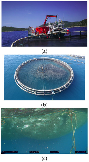 Today, net pens are cleaned using commercially available machines for underwater net cleaning (Figure 5a). Regardless of the development of underwater net washing technology, nets must be pulled from the sea and thoroughly washed at regular intervals. Conventional methods of monitoring and maintaining marine fish farms are currently conducted exclusively manually (farm staff and/or hired divers inspect the condition of net pens above and below sea level, net fouling, damage to nets, etc.) or using aerial robots and remotely operated underwater vehicles (ROVs), which simplify and speed up the monitoring process but do not automate or reduce the cost of paying professional vehicle operators or training farm staff to work with the vehicles.