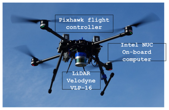The Light Autonomous Aerial Robot (LAAR) (see Figure 7) used in the HEKTOR project is a medium-sized carbon-based quadcopter powered by two LiPo batteries (Figure 2). The dimensions of the LAAR are mm and a mass of 8 kg to 10 kg, depending on the sensor equipment installed on the UAV. The flight time of the LAAR is around 30 min, with the possibility of manual flight mode and performing autonomous flight missions. The maximum wind speed for safe operation of the LAAR is 15 m/s. The propulsion system consists of four T-motor P60 KV170 motors with foldable propellers, capable of generating a maximum thrust of 68 N. The LAAR flight control system consists of the primary Pixhawk autopilot module and the Intel NUC on-board computer used to implement complex control algorithms and real-time data processing from sensors.
