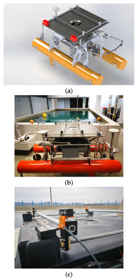 Platform for landing the LAAR on ASV Korkyra. (a) SolidWorks model rendering. (b) Constructed prototype version for laboratory testing, mounted on the ASV. (c) Stepper motors (in black boxes) and four integrated contact switches for the control system of the LP.