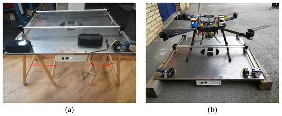Test setups for the landing platform. (a) Test setup in the laboratory with a control box. (b) Outdoor test setup with manual landing of the LAAR and semi-automatic control of the LP in Zagreb, Croatia.
