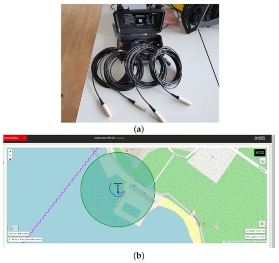 (a) WaterLinked Underwater GPS G2 topside with 4 transducers for underwater acoustic localization. (b) Web GUI on the topside computer that allows system setup and visual tracking of the ROV on a georeferenced map.
