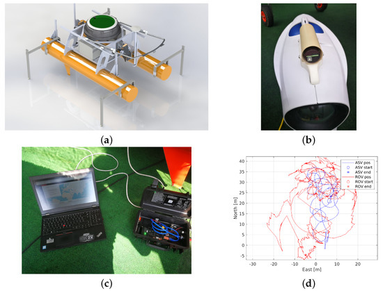 For the underwater inspection of net pens, the ROV must be able to navigate around the entire submerged portion of the net pen and capture video (Figure 5c). Localization of the ROV with respect to the net pen will be accomplished by an acoustic localization system. For this purpose, there should be cooperation between the ROV and the surface platform (ASV), i.e., the surface platform must constantly monitor the position of the ROV to reduce the number of cables connecting it and the surface platform (ASV) in the sea, thus reducing the disturbance caused by the sea currents.