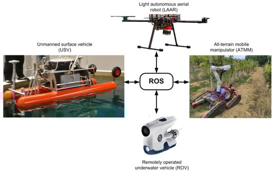 The solution of these problems in modern viticulture and mariculture is sought in the project HEKTOR—Heterogeneous Autonomous Robotic System in Viticulture and Mariculture [3,4]. The main goal of the HEKTOR project is to find a systematic solution for the coordination of intelligent heterogeneous robots/vehicles (marine, terrestrial and aerial) capable of cooperating autonomously with each other in the open, unstructured space/water environment. HEKTOR is a robotic system consisting of four different types of robots that communicate and cooperate via an ROS-based middleware. They are a ground robot in the form of an all-terrain mobile manipulator (ATMM) for vineyard work, a lightweight autonomous aerial robot (LAAR) for both viticulture and mariculture scenarios and a remotely operated underwater vehicle (ROV) and an autonomous surface vehicle (ASV) for maritime work. The system overview of HEKTOR vehicles is shown in Figure 1.