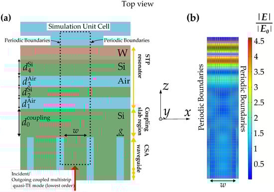 The system is composed of three parts (see Figure 1a and Figure 2b, see yellow arrows): the CSA waveguide, the STP resonator and a region of a continuous Si slab in between (slab coupling region). The structure is modeled and simulated using a finite element method (FEM) software package (COMSOL Multiphysics 5.5). The lateral periodicity enables efficient simulations via periodic boundary conditions.