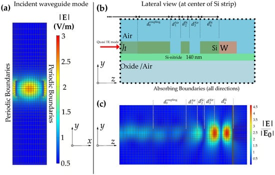 (a) Electric field profile with 800 nm and air as a substrate for the incident quasi-TE mode (lowest order) of the coupled strip obtained from boundary mode analysis. (b) Illustration of the layer stack showing the lateral cross-section at the slab center. (c) Same cross-section as (b) but showing the profile of the electric field enhancement. The field profiles show the mesh elements from the corresponding perspective. Note the high mesh density at the Si–W interface for accurate evaluation of the power absorbed by the metal.