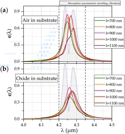 We first show the spectral response of the waveguide–resonator system, when the all Si structures are solely funded on a thin silicon nitride membrane of 140 nm thickness. Such a configuration provides an extremely high degree of light confinement due to strong refractive index contrast. As can be seen from Figure 3a and Table 2, we observe high absorptances for values of up to 0.88 for h = 0.9 µm and only slightly lower values for h = 0.7 and 0.8 µm. Interestingly, we observe a red shift from = 4.25 to 4.28 µm together with a slight drop of peak emittance when increasing h to 1 and 1.1 µm. It has to be pointed out that the quasi-crystal approach for dimensioning the STP resonators is able to yield resonances almost exactly at the target desired wavelength = 4.26 µm without the necessity of scaling. This is despite the heuristic dimensioning approach for the slab coupling region using the averaged effective index .