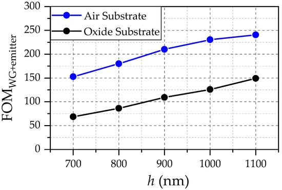 In addition, the Q factors are remarkably high when compared with conventional TP structures featuring tungsten in previous studies [2]. The values for the FOM (3) (the sensitivity) increase monotonically with increasing h, despite the drop of the peak absorptance (or, equivalently, emittance ) for nm. This reflects the dominance of the reduced waveguide damping due to increasing confinement within the silicon (and mitigating the damping of the nitride) as can be seen in Figure 4 (black solid line).