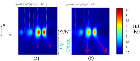 This is illustrated by comparing the electric fields in the two panels in Figure 5. In panel (b), an enhanced electric field can be observed, indicating the increased radiation losses into the substrate compared to panel (a). In addition, the plasmonic field enhancement within the Si cavity is reduced in panel (b) as a result of these increased losses. Clearly, panel (b) features oxide as substrate material, whereas panel (a) features air in this region. Both structures feature the slab thickness nm.