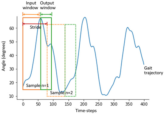 Illustration of the sliding window method. Continuous gait trajectories are used to generate input and output windows for training the model using the sliding window method. Each pair of input and output windows forms one sample. Several samples can be generated from one continuous gait trajectory by sliding the window for a specified distance, also known as stride length.