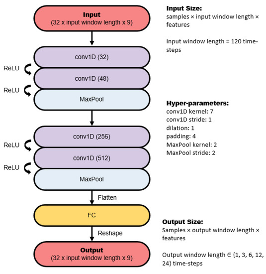 To select the hyper-parameters and architecture for the CNN, LSTM, and FCN models (described in Section 2.3, Section 2.4 and Section 2.5), a hyper-parameter search was performed. Hyper-parameter optimisation involved defining a search space, where windows of values of some parameters of the model were chosen (e.g., learning rate, number of layers of LSTM, number of hidden units, and size of kernels). The objective is to choose the value of parameters that optimises the performance of the networks. The tree-structured Parzen estimator algorithm, which is a type of Bayesian hyper-parameter sampler [37], was used to select the optimal parameters (from a defined search space) that minimise the validation loss. The search space for the hyper-parameters and the corresponding selected values are included in Table 1. The parameters were optimised for predictions with an input window size of 72 time-steps, and an output window size of 12 time-steps. The number of epochs was also a parameter that was included in the hyper-parameter optimisation, but the values were fine-tuned manually afterwards. The numbers of epochs for training the LSTM, CNN, and FCN were 60, 150, and 180, respectively. Once the optimal architecture and parameters of the networks were selected, the training and validation sets were combined to train these networks. The total numbers of trainable parameters of the optimised LSTM, CNN, and FCN are 495,320, 4,666,888, and 380,216, respectively. The final performance of the networks was evaluated on the testing set.