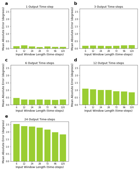 Results in Table 2 show that the smaller the size of the output window, the lower the error of predictions. LSTMs predicting one output time-step had the lowest mean errors, while LSTMs predicting 24 time-steps had the highest mean errors, as expected. On the other hand, the size of the input window did not significantly influence the mean losses when predicting short output windows, specifically six output time-steps or below (see Figure 4a–c). The size of the input window had an influence when predicting larger output windows, i.e., 12 and 24 time-steps, with larger input sizes resulting in lower mean errors (see Figure 4d,e). For 12 and 24 time-step output windows, using 120 time-steps as input window size, which is the largest input size we tried, led to the lowest mean absolute errors (see Figure 4d,e).