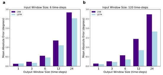 Comparison of the performance of the CNN and LSTM network, measured by MAE, for varying output window sizes. In (a), the input size is fixed at 6 time-steps, while in (b) the input is fixed at 120 time-steps.