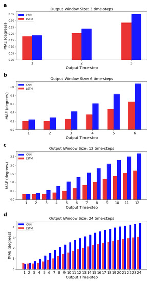 Mean absolute errors for each individual time-step predicted by the LSTM and CNN for a given output window. Input window size is fixed at 120 time-steps. Sub-figures (a–d) correspond to networks with 3, 6, 12, and 24 output time-steps, respectively.