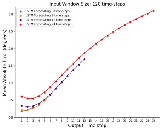 Mean absolute errors for each individual time-step predicted by the LSTM networks with 3, 6, 12, and 24 output window sizes. Input window size is fixed at 120 time-steps.