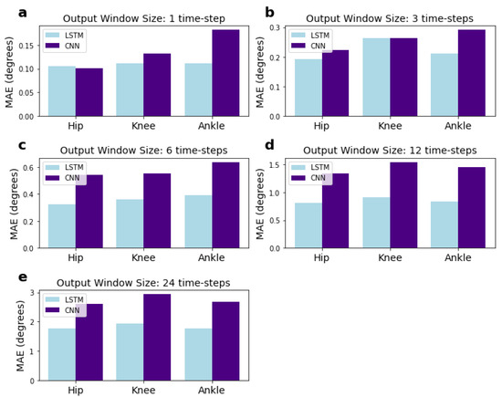 Our results show that the LSTM’s performance is better than the CNN. However, the difference between the MAE of the two networks was larger with larger input and output window sizes. The performance gap, measured in MAE, was highest with 120 time-steps as input, and 24 time-steps as output, and was 0.91 degrees. There was one case where the MAE for the CNN was higher than the LSTM, which used the smallest combination of input and output windows (six and one time-steps, respectively). For this case, the difference in MAE between the CNN and LSTM was small, 0.014 degrees, and the CNN had a higher standard deviation. Our results are different from those of Moreira et al. [40], who found that the CNN was more robust for ankle joint torque estimation based on kinematics, speed, and anthropometry. Our results are also different from those of Molinaro et al. [41], in which a temporal convolution network (with dilated convolution layers) outperformed an LSTM implementation. It must be stressed that Molinaro et al. considered joint moments rather than joint angles.