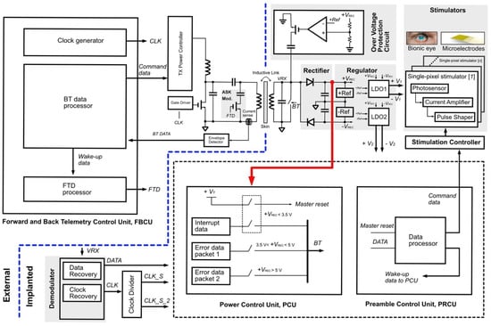 For wireless IMDs, the power transfer efficiency (PTE) is of prime concern because power loss during wireless transmission can lead to electromagnetic radiation exposure and secondary heating effects [5]. The PTE is largely determined by the coupling coefficient of the inductive link but is also affected by the battery, power amplifier switching circuit, tissue status, and power conditioning, e.g., the alternating current (AC)–direct current (DC) and DC–AC converters [6]. However, the secondary coil geometry of the inductive-coupled coils is limited by the shape of the eyeball, which has a diameter of approximately 2.5 cm. This small coil dimension reduces the quality factor of the coil, which is proportional to the coupling coefficient; thereby reducing the total PTE. To compensate for the poor PTE, various coil optimization techniques for near-field inductive-coupling power transmission have been proposed [5,7,8,9,10,11]. However, the PTE is still reduced by coil misalignment inside the eyeball, which often occurs after implantation or during eye rolling [12,13]. This causes a power disruption; thus, the implanted system can break down because of an insufficient power supply. Therefore, power control units (PCUs) are indispensable in IMDs—particularly retinal implants that consume high power—to monitor prosthetic device operation and efficiently manage the power distribution. For example, the PCU can observe the rectified voltage in the IMD to determine whether it exceeds the safe voltage level of the receiver. When the IMD receiver enters a worse power condition, the PCU turns off several functional blocks, saving power and preventing malfunctions of the IMD. Subsequently, the PCU in the receiver (Rx) provides the error data to the transmitter (Tx). Consequently, the Tx can adjust the wireless power transmission supply in real time. The two-way communication between the Tx and Rx allows sufficient power delivery to the implanted devices.