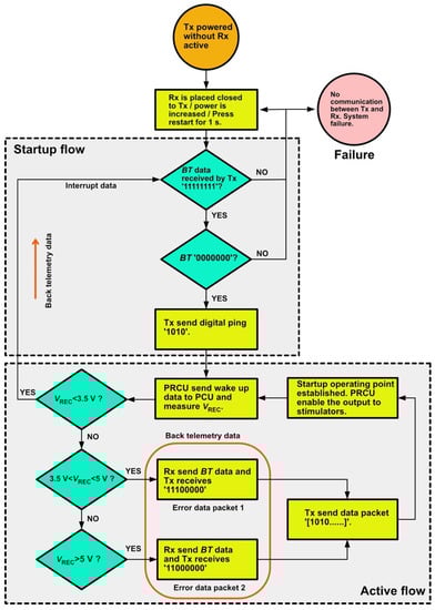 The detailed operation of the proposed system is shown in the flow diagram of Figure 2. This diagram illustrates the flow of the system operation from start-up to active function. During the start-up operation, the receiver coil must be placed close to the transmitter coil. Therefore, a bitstream of long “1” data is expected in the initial state, followed by long “0” data when the receiver is present. The transmitter initiates the handshake by transmitting a digital ping. The PRCU processes the ping data and generates wake-up data for the PCU.