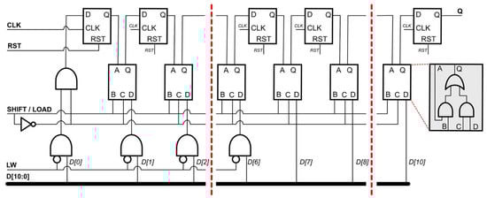 Figure 3a shows the timing diagram of VREC, M_RST, BT, and FTD, and Figure 3b–d show the digital controllers PCU, PRCU, and FBCU, respectively, proposed in this work. As discussed in the previous section, the operation of the implanted system relies on a sufficient wireless power transfer efficiency, which is commonly affected by misalignment of the coils between the transmitter and receiver. It is essential to manage the power distribution in the entire block while continuously maintaining its safety level. The PCU shown in Figure 3c plays an important role in tracking the rectified voltage level. As shown in Figure 3a, the master reset signal M_RST is triggered when VREC is <3.5 V. Consequently, interrupt data are generated at BT. The interrupt data composed of the CLK_S signal fill the registers in the SP block of the FBCU, as shown in Figure 3a. Because the clock signal of the SP is CLK_S, the Q [0:10] registers hold data 1. When VREC reaches 3.5 V, M_RST becomes low, and simultaneously, the BT signal becomes low because CONT is “0”. LT becomes “0” when registers Q [8], Q [9], and Q [10] are “0”, “1”, and “1”, respectively. The parallel-to-serial converter circuit is shown in Figure 4. The data D [10:0] are loaded in PS when LT is “0”. LW holds the initial value of “1”, which sets the information data in PS to “0”. When LT becomes “1”, the digital ping with a code of [1010000000] is transmitted to the receiver and processed by the SP block in the PRCU.