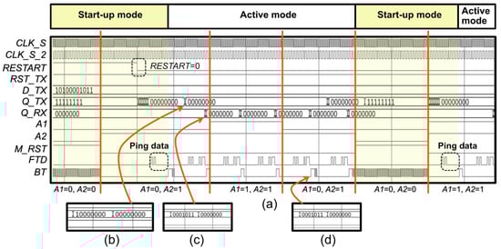 The proposed digital controllers shown in Figure 3 were designed and simulated using the ModelSim tool. CLK_S and CLK_S_2 were set as 2 and 1 MHz, respectively, with a duty cycle of 50%, and D_TX was set as [10100001011]. The duration of the Tx data packet (D_TX) was 5.5 µs. The simulation started with A1 = 0 and A2 = 0 (start-up mode), representing VREC < 3.5 V. As shown in Figure 5a, M_RST became “1”, and the receiver sent interrupted data to the transmitter. Digital ping data were sent to the receiver when M_RST and RESTART became “0”. For A1 = 0 and A2 = 0, the output of Q_TX was [11111111]. For A1 = 0 and A2 = 1 (active mode), the BT sent error data packet #1 to the transmitter, and Q_TX produced [10000000], as shown in Figure 5b. Q_TX output [00000000] when the FTD sent data to the receiver, and Q_RX produced [0001011] from the FTD, as shown in Figure 5c. In the following clock cycle, both A1 and A2 were set as “1” (active mode). Thus, BT generated error data packet #2 and Q_TX output [00000000]. The simulation results confirmed that the operation of the proposed digital controller matched the flow diagram shown in Figure 2.