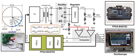 Figure 6 shows the experimental setup for the proposed system, which was composed of a class-E amplifier in the transmitter to wirelessly transmit power through an inductive link. The Tx coil was fixed on a printed circuit board, whereas the Rx coil was attached to an eyeball model with a rotating platform for an angular misalignment test. The received signal, i.e., VRX, was rectified and then regulated by a low-dropout voltage regulator (LT 3032, Analog Devices, Wilmington, MA, USA) to supply 2.5 V. The reference voltages REF1 and REF2, which were 1.5 and 1.1 V, respectively, were fed into comparators (TS391SN2T1G, Onsemi, East Greenwich, RI, USA). The rail voltage of the comparators was 2.5 V (supplied by LT3032). With the attenuated voltages of 1.5 and 1.1 V, when the VREC voltages were 5 and 3.5 V, respectively, the input offset voltages in the comparators caused a nonzero input voltage difference, which drove the outputs of A1 and A2 to 2.5 V (bit “1”) or 0 V (bit “0”). In the case of zero input voltage difference in the comparator, the output was centered at 1.25 V, corresponding to bit “1”. Furthermore, a field-programmable gate array (FPGA, Basys 3) processed A1 and A2. The programmed FBCU, PCU, and PRCU in the FPGA generated the output signals displayed by the oscilloscope. The PCU generated BT and M_RST signals, the PRCU generated Q_RX [3:0] signals, and the FBCU generated Q_TX [7:0] signals.