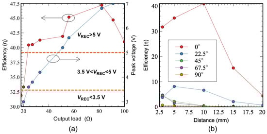 The relationship between the power transfer efficiency and the output load variation was examined, as shown in Figure 7a. The maximum efficiency in this setup was 47% for RL = 82 Ω. The peak voltage of the RX signal is shown in the same figure. The minimum peak voltage of the VREC required in our system was 3.5 V, which was achieved at RL = 23 Ω. In this case, a 152 mA current flowed to the load, which was sufficient for our application. Additionally, the effect of the angular misalignment on the power transfer efficiency was evaluated, as shown in Figure 7b. The angle of the RX coil shown in Figure 6 was changed from 0° to 90°, while the distance d was changed from 0 to 20 mm. The maximum power efficiency of 40% occurred for d = 10 mm, with the TX and RX coils aligned. Significant power loss was observed when the RX coil moved to the 22.5° position, with a reduction of >30% in the power efficiency. To maintain a VREC of >3.5 V that produces A1 = 0 and A2 = 1, the minimum power efficiency of the system should be 33%. This occurs when the Tx coil is perfectly aligned with the Rx coil.