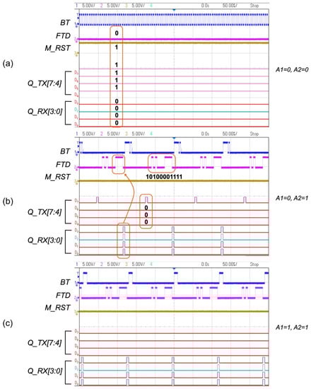 A Basys 3 FPGA board was programmed to verify the functionalities of the proposed digital controllers (FBCU, PCU, and PRCU) when A1 and A2 were input to the PCU. The utilization reports of FPGA were tabulated in tables in Appendix A. The transmitter and receiver controllers were implemented in a single FPGA (Basys 3). The measurement results are shown in Figure 8. For all the conditions, the transmitted data, i.e., D_TX [10:0], were set as [10100001111]. In the worst-case condition, as shown in Figure 8a, Q_TX [7:4] and Q_RX [3:0] became [1111] and [0], respectively, as FTD remained at “0”. In the typical case of A1 = 0 and A2 = 1, as shown in Figure 8b, Q_TX [7:4] changed to [1000], and the RX data of [1111] were captured for Q_RX [3:0]. The same Rx data were obtained for the best-case condition, as shown in Figure 8c, while Q_TX [7:4] became [0], indicating that the power level of the implanted system was stable. These experimental results agree with the simulation data shown in Figure 5.