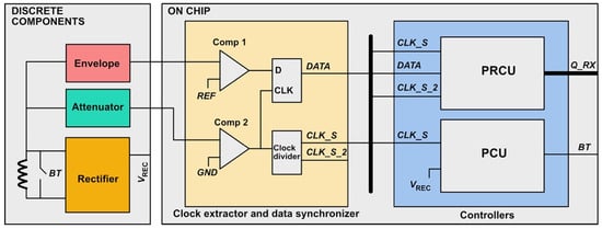 As shown in Figure 9, a hybrid architecture of the receiver system that includes discrete components and the fabricated chip was proposed, which will be investigated in future research. The PCU and PRCU were fabricated along with a clock extractor and data synchronizer. The attenuator, envelope detection circuit, and voltage rectifier were wirelessly powered through an inductive link. For back telemetry communication, a capacitive load modulation circuit will be added in the near future. Connecting a capacitor in parallel with the coil modulates the impedance observed by the coil, which is then reflected to the primary side. The change in the current in the transmitter coil due to the reflected impedance can be interpreted by the transmitter controller.