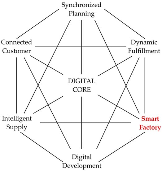 The concept of the Smart Factory (SF) is a very important part of the I4.0 revolution, as it combines physical machines and business processes (cyberphysical systems) using sophisticated techniques involving Artificial Intelligence (AI), statistical analysis and optimisation. It is envisaged as a flexible system that is able to adjust its performance reacting to its current environment. This is performed using collected production data and by the autonomous control of machinery [7]. Furthermore, SF is a part of the supply chain, where information from the shop floor can be used to enhance relationships with suppliers and customers [8]. Figure 1 shows an illustration of bodies taking part in the digital supply network and their interconnections. This diagram shows how each entity can generate and share information to adjust to a changing environment.