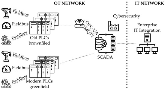 Another prevalent issue with brownfield sites is missing or out of date documentation of industrial machines. Drawings of assets that are not properly maintained in configuration control make the replacement of Programmable Logic Controllers (PLC) or sensors much more labour intensive than retrofitting [18]. Figure 2 shows an example of connecting shop floors’ assets via old and modern PLCs to an enterprise network. This illustrates the flow of data from an OT network crossing a boundary through cybersecurity to the IT enterprise network.