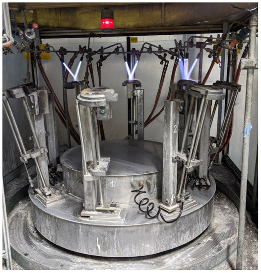The machine is supplied with four gasses to perform the brazing operation. The brazing process is performed with an open flame using the combustion of natural gas and oxygen. These gases are mixed and ignited, powering a total of three burner stations. As detailed above, the braze is protected from oxidisation using a purge of nitrogen gas at one station. To power the movement of the machine table, compressed air is used as an actuator. Compressed air is also used for cooling the unit before removal. The machine has three states: off, idle, and auto. While off, the machine has no gas burners lit and no gas should be consumed. In practice, a small amount of gas is consumed due to leakage. While idle, the burners are lit, and the oxygen and natural gas are consumed. In auto mode, the machine is performing the process to produce parts and therefore all four gasses are consumed. Figure 4 shows a photograph of the Automatic Brazer with the gas burners on.