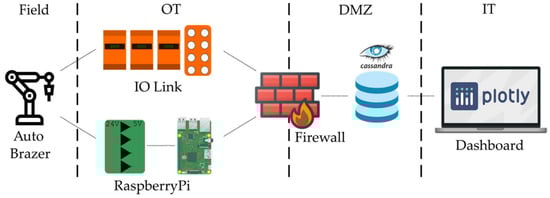Figure 5 illustrates the installed data collection solution. The figure shows the flow of data from the field device to the end user on the IT enterprise network. Process information and status of the Automatic Brazer was collected by the Raspberry Pi and the IO Link Master. Both these devices were provided with ethernet connectivity to a Firewall device. This device provided the necessary cybersecurity solution, as well as the essential routing function to the demilitarised zone (DMZ) between the OT and IT networks; also located in the DMZ was the OSS Cassandra database server for storing the SF data. Having the database located in the DMZ allowed access from both OT and IT devices. The end user would access the data about the field device through a web browser dashboard using their company PC on the IT network.