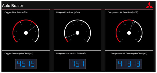 The live status of the flow rate is displayed via virtual gauges, allowing production managers to monitor the values and view the current state of the machine. Figure 7 shows the Python dashboard in use, the three gauges show the live flow rate, and a numeric indicator shows the total gas consumption since installation (oxygen, nitrogen and compressed air).