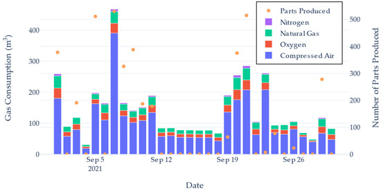 The parts produced time series data were resampled into bins of 30 min. If a unit was processed at any time during the window, the mask was given a value of 0 to mark the period as productive. All other windows were given a value of 1 to mark a period of inactivity. Multiplying the result of the mask with gas consumption data provided an extraction of all total waste.